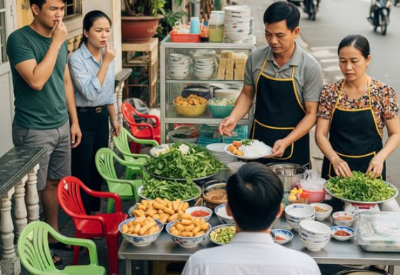 Cả hai người đều đã kiệt sức vì tiền nhà, tiền nợ, lại thêm cảnh sống “không thở nổi” vì mùi. Tôi tức tối, nói với vợ: phải làm gì đó cho bọn họ biết thế nào là cư xử, đừng nghĩ mình có quyền lấn chiếm không gian sống của người khác. Vợ tôi dịu lại, khuyên nhẫn nhịn. Nhưng những đêm mất ngủ, miếng cơm nguội trên mâm, tôi nuôi một kế hoạch nhỏ: sáng hôm sau sẽ đánh liều để lại trước quán một nắm lá mơ với ba củ giềng — thứ mà thằng bé hàng xóm vô tình thừa nhận “rất ghét mùi này” — để xem liệu chủ quán có dám phản ứng, hay xóm làng có lên tiếng không. Tôi muốn “kịch” — một cảnh vừa phạt vừa công khai cho họ biết mặt.