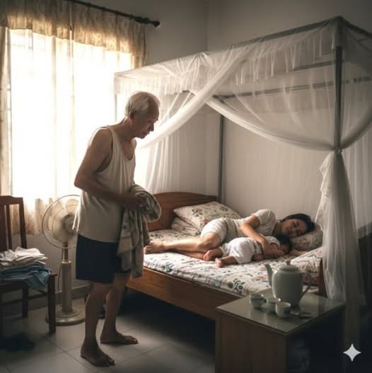 Ông tiến lại gần, nhẹ nhàng vén tấm chăn trên người con dâu. Hà My nắm chặt bàn tay, đầu óc căng thẳng không biết chuyện gì sẽ xảy ra. Nhưng ngay sau đó, cô cảm thấy có vật gì được đặt xuống chăn, rồi ông lặng lẽ quay đi, còn khép cửa rất khẽ.
