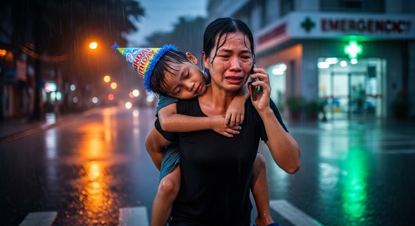 Không ai trả lời. 20 cuộc gọi, 30 cuộc… vẫn im lặng. Lúc Bin bắt đầu co giật, Hạnh run rẩy ôm con, vừa khóc vừa gào: “Con ơi, cố lên con, đừng làm mẹ sợ…”. Cô bế con chạy ra đường giữa mưa đêm, bắt taxi lao thẳng đến bệnh viện. Vừa đến nơi, bác sĩ hô lớn: “Cấp cứu! Đưa bé vào phòng hồi sức gấp – có dấu hiệu viêm màng não cấp!”. Hạnh đứng ngoài hành lang, ướt đẫm, tim như vỡ ra. Đôi tay run rẩy cầm điện thoại, Hạnh gửi tin nhắn cuối cùng cho chồng: “Chồng ơi… cứ…u con mình…”. Rồi cô gục xuống sàn lạnh, ngất lịm.