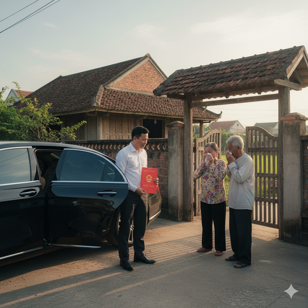 Trong tay anh là ba quyển sổ đỏ. Cả họ hàng ùa ra, ai cũng nghĩ: “Anh thành đạt, nay về báo hiếu cha mẹ rồi!” Không khí rưng rưng xúc động.