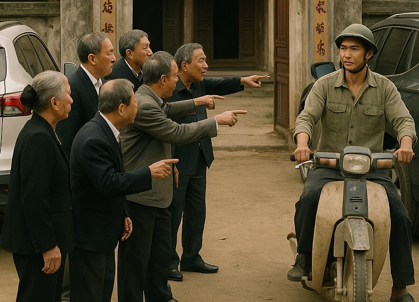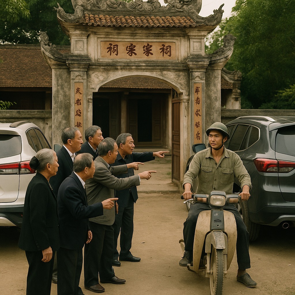 Ngày giỗ tổ họ Nguyễn, cả làng rộn ràng. Từ sáng sớm, những chiếc ô tô bóng loáng lần lượt lăn bánh vào sân nhà thờ họ. Các cô chú, anh em trong họ, ai nấy diện đồ bảnh bao, bước xuống từ những chiếc xe đời mới, tiếng cười nói rôm rả. Họ khoe mẽ về công việc, nhà cửa, và cả những chuyến du lịch nước ngoài. Trong dòng xe ấy, chỉ có Nam, đứa cháu út trong họ, lộc cộc chạy chiếc xe máy cà tàng, bụi đường bám đầy áo.