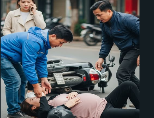 Đang đi giữa đường, bất ngờ chiếc xe máy phanh gấp tránh một ô tô vượt ẩu. Tôi bị hất mạnh, ngã quỵ xuống, nước ối vỡ tung trên nền đường loang lổ nước mưa. Người qua lại xôn xao, có người hét lên: