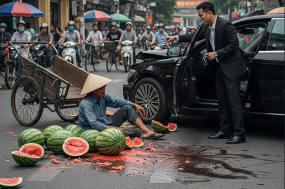 Chồng tôi đi bán dưa hấu rồi bị chiếc ô tô đâm phải, người lái ô tô bước xuống còn đập nát quả dưa hấu trước mặt chồng tôi rồi hỏi “đi đứng thế à”