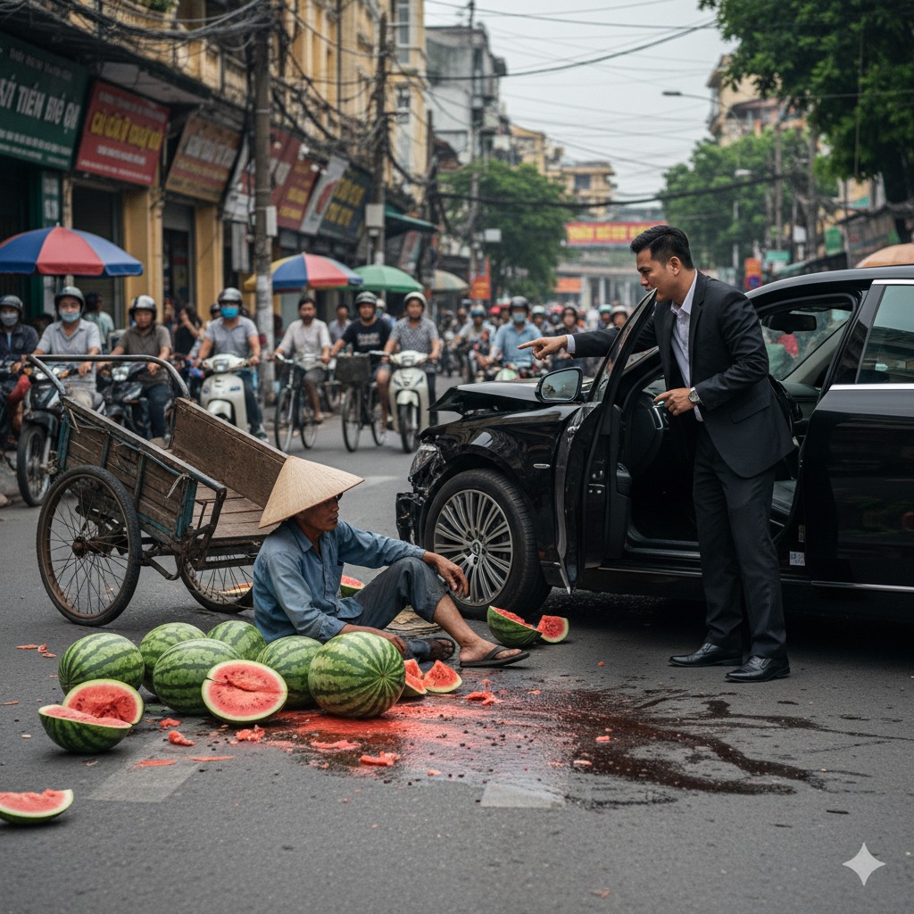 Người lái ô tô – một gã đàn ông béo tốt, áo sơ mi trắng phẳng phiu – bước xuống xe. Thay vì hỏi han, gã cúi xuống nhặt một quả dưa còn nguyên, đập mạnh xuống đất ngay trước mặt chồng tôi. Ruột dưa đỏ hồng tung tóe. Gã nhếch mép cười:
