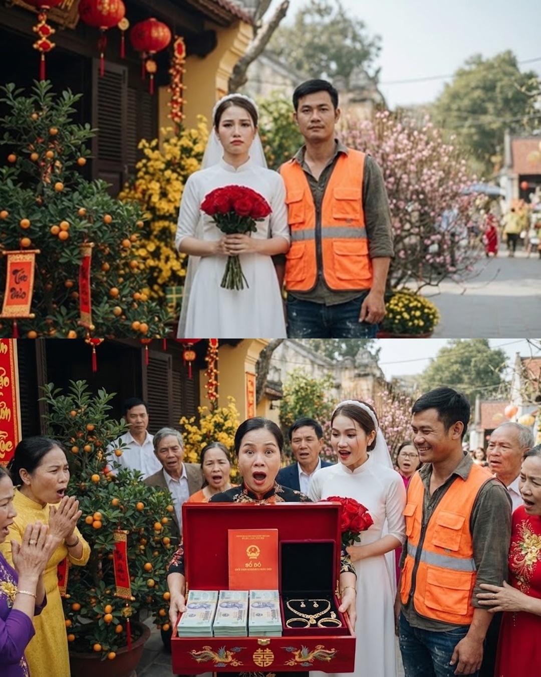 Bà bác mở nắp tráp trầu cau, rồi đến tráp lễ đen. Cả hội hôn nín thở. Trong chiếc hộp sơn mài đỏ chót, không phải là phong bì mỏng dính. Mà là 4 cọc tiền polymer mệnh giá 500.000 đồng, được xếp ngay ngắn, dày cộp. Bên cạnh là một chiếc sổ đỏ và một hộp nhung đựng bộ trang sức kim cương lấp lánh.