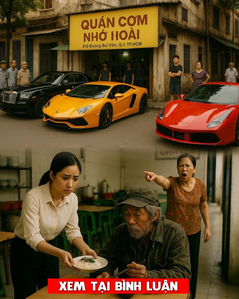 Năm chiếc xe sang — một Rolls-Royce, hai Lexus, một Mercedes, và một BMW — nối đuôi nhau đậu trước quán cơm nhỏ. Tài xế bước ra, mặc vest đen chỉnh tề. Người dân xung quanh kéo đến xem, xì xào bàn tán.