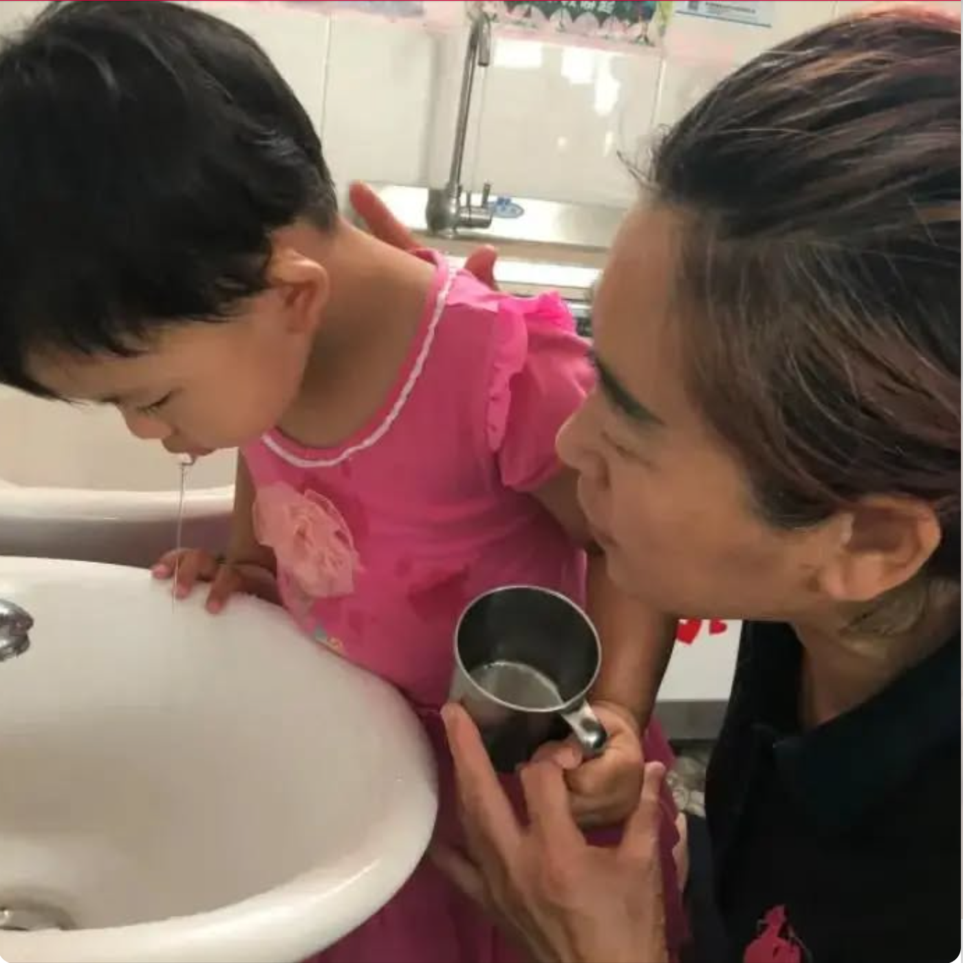 Nghe tiếng con, người mẹ lập tức chạy vào phòng. Sau khi hiểu rõ sự việc, cô không hoảng loạn hay vội cho con ăn uống mà nhanh chóng súc miệng cho trẻ bằng nước ấm, làm sạch khoang miệng rồi đưa con đến bệnh viện.