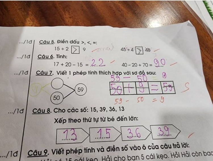 Cụ thể, đề bài đưa ra là viết 1 phép tính thích hợp vào sơ đồ và em học sinh đã thực hiện phép tính “50 + 9 = 59”. Tuy nhiên lại bị cô giáo gạch sai và viết lại lời giải đúng là “59 – 50 = 9”. Người mẹ nghĩ mãi vẫn không hiểu lý do tại sao nên đã đi hỏi. Thật bất ngờ, 100% những đáp án được đưa ra, mọi người đều khẳng định cô giáo làm đúng.