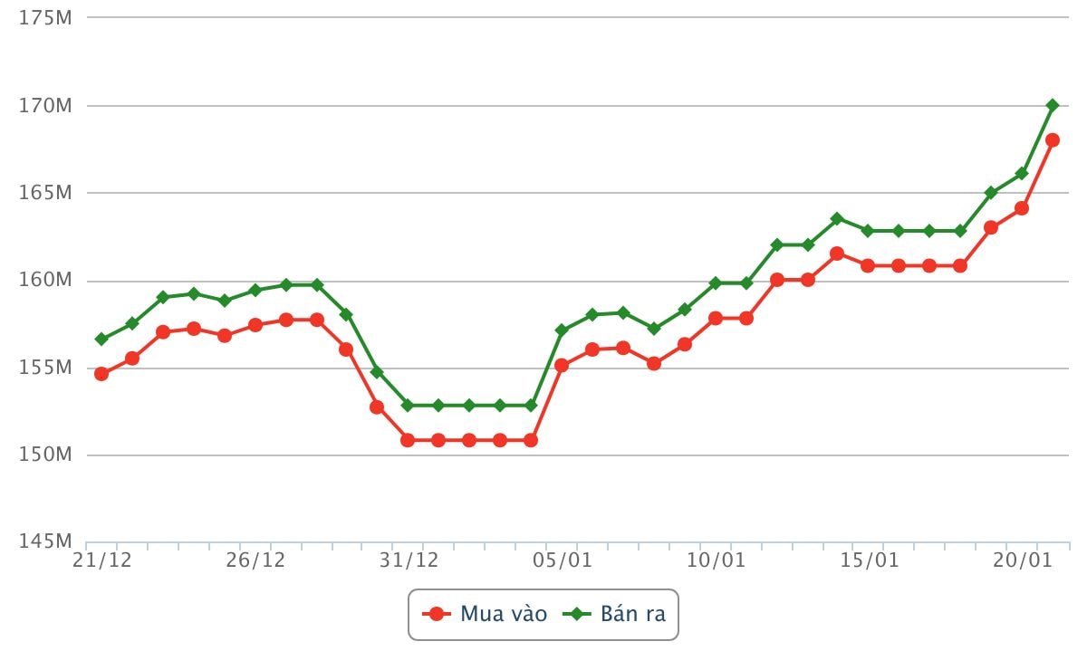 Cùng chung xu hướng, DOJI cuối phiên chiều nay 21/01 niêm yết giá vàng miếng SJC với mức tăng gần 4 triệu đồng/lượng. Giá mua vào tại đây đạt 168,0 triệu đồng/lượng, tăng 3,9 triệu đồng so với phiên trước. Giá bán ra cũng được đẩy lên 170,0 triệu đồng/lượng, với mức tăng 3,9 triệu đồng.