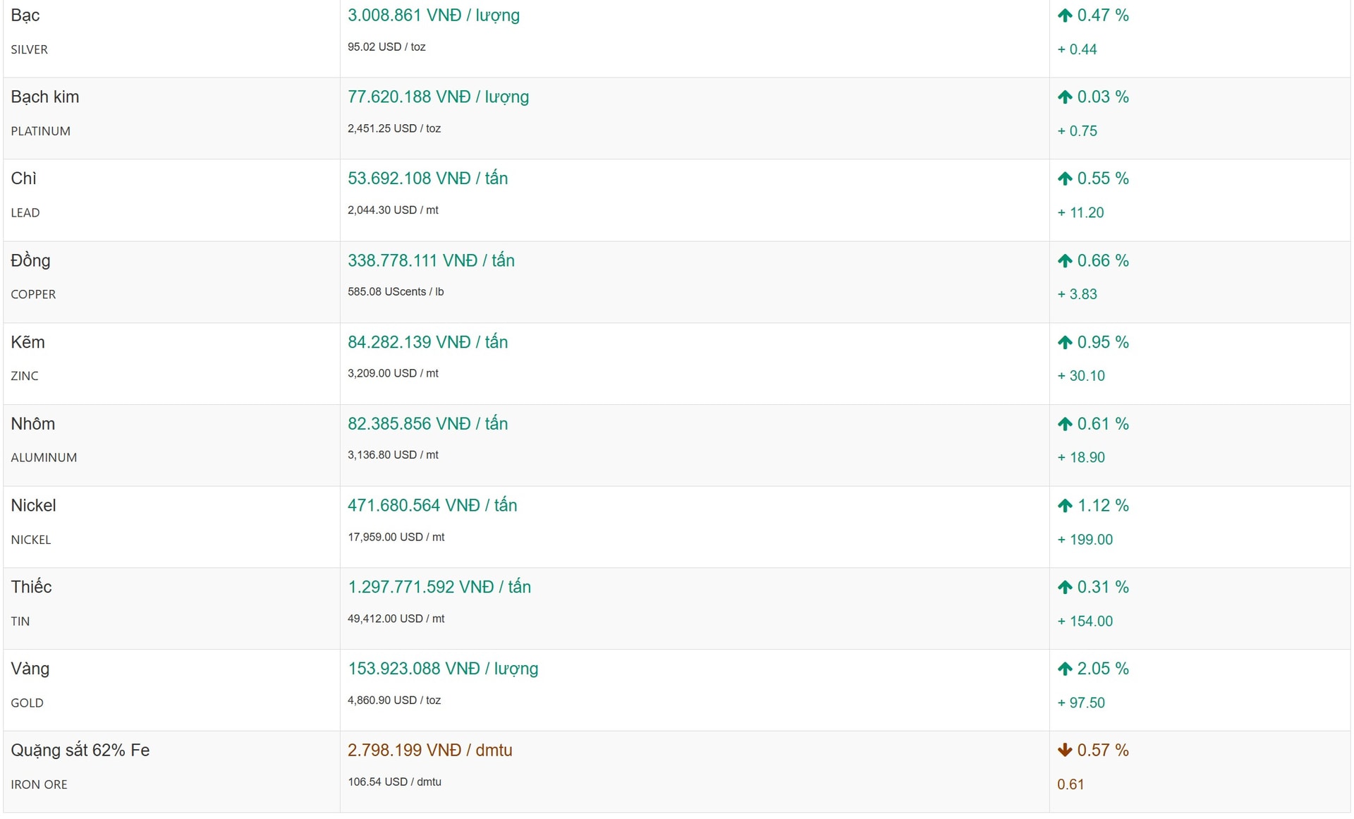 Nhôm ghi nhận mức tăng 0,61%, tương ứng với mức tăng 18,90 USD/mt, hiện đứng ở mức giá 82.385.856 VNĐ/tấn.