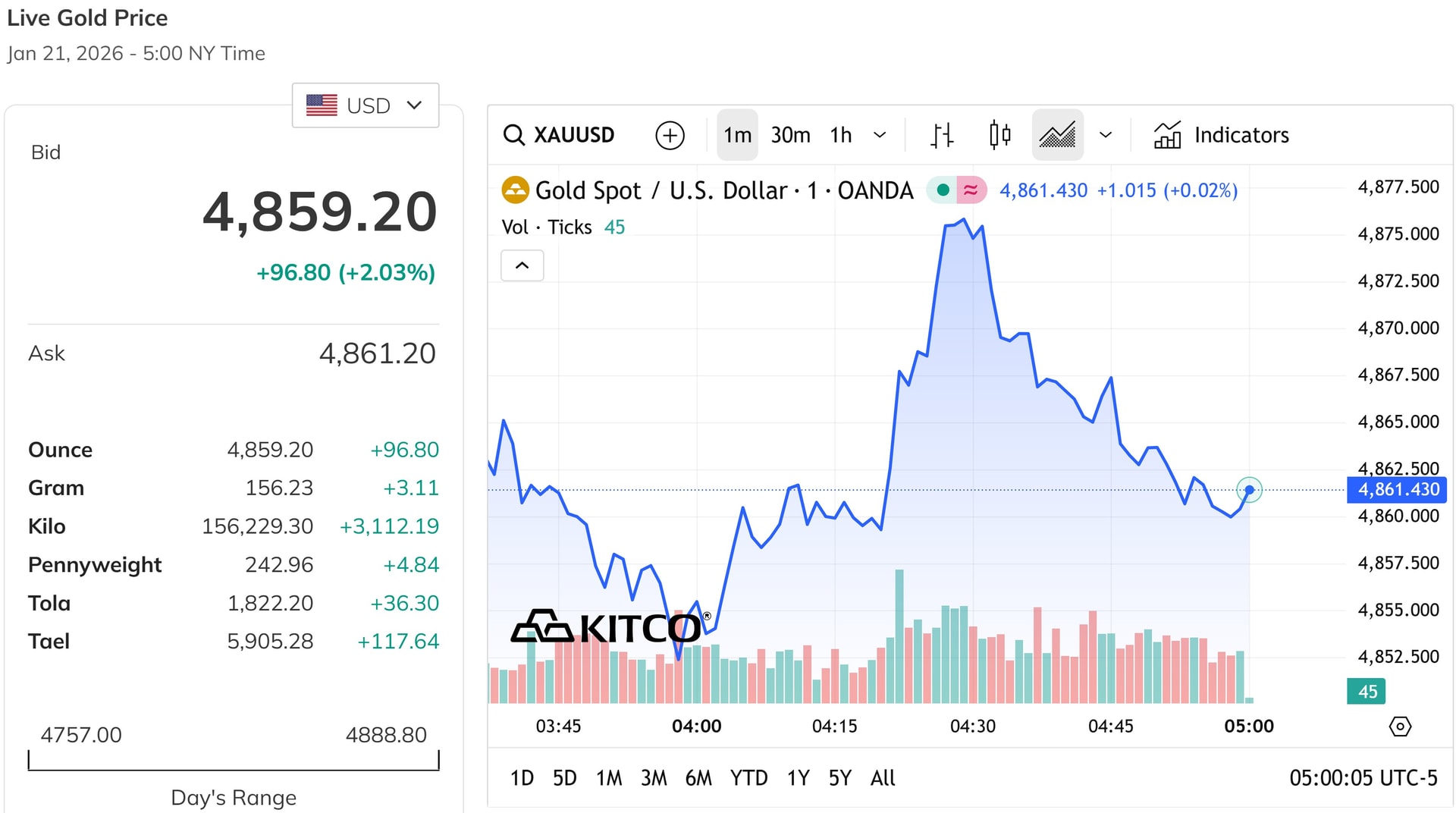 Tính đến 17h00 ngày 21/01/2026 (giờ Việt Nam), giá vàng thế giới giao ngay mức 4.859,2 USD/ounce. Ghi nhận tăng 96,8 USD/ounce trong ngày ngày hôm qua. Quy đổi theo tỷ giá USD tại ngân hàng Vietcombank (26.380 VND/USD), vàng thế giới có giá khoảng 154,5 triệu đồng/lượng (chưa tính thuế, phí). So sánh với giá vàng miếng SJC trong nước cùng ngày (168,0-170,0 triệu đồng/lượng), giá vàng SJC hiện cao hơn giá vàng quốc tế khoảng 15,5 triệu.