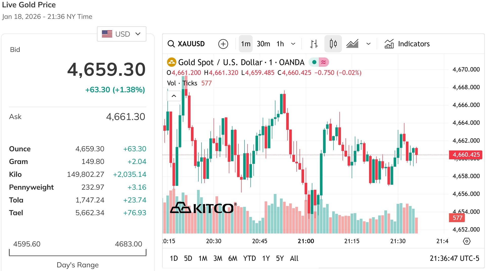 Trên thị trường quốc tế, đến 09h30 ngày 19/01/2026 (giờ Việt Nam), giá vàng giao ngay đạt 4.659,3 USD/ounce, tăng 31,6 USD/ounce so với phiên trước, tương đương mức tăng gần 1,5%.