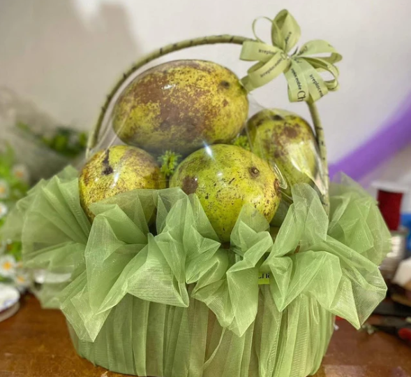 Dù được bày biện gọn gàng trong một lẵng màu xanh khá bắt mắt, phần vỏ xoài kém mịn màng lại khiến cư dân mạng tranh luận dữ dội.