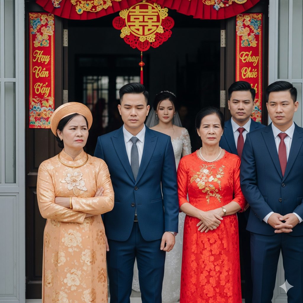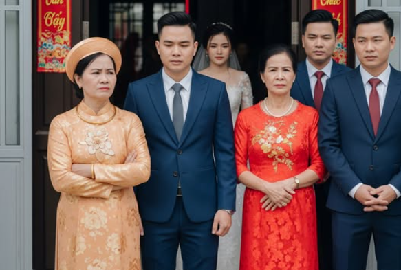 Trước giờ rước dâu mười lăm phút, sân nhà văn hoá lốp bốp tiếng mưa. Mẹ Minh, bà Phượng, xốc lại cổ áo dài, giày gót nhọn gõ cộp cộp trên gạch. Bà đứng trên bục, giọng lanh lảnh như dao mỏng: “Hôm nay nhà chúng tôi… đi tay không rước dâu. Vì con dâu lớn tuổi hơn con trai tôi, lại đang bán quán nước kiếm sống, bố của con dâu chỉ là bảo vệ ngân hàng chẳng có gì trong tay. Lương tháng cũng chỉ bằng số lẻ của giúp việc nhà tôi. Thế nên… đi tay không tới rước dâu cũng là may lắm rồi.”