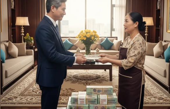 Một hôm, nhận được tin chồng ở quê ốm nặng, chị Hòa xin nghỉ hẳn để về chăm chồng. Trước khi đi, ông chủ bất ngờ gọi chị vào phòng riêng, lặng lẽ đưa cho chị một bọc tiền, bảo là 100 triệu gọi là “ơn nghĩa bao năm chị phục vụ tận tụy”. Chị Hòa rưng rưng nước mắt cảm ơn, vội vã sắp xếp hành lý bắt xe khách về quê.
