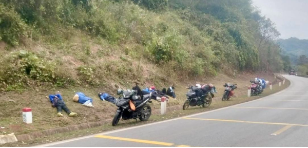 Trải qua hành trình nhiều giờ đồng hồ di chuyển đi trên đường trong thời tiết lạnh lẽo, mưa phùn nên nhóm người muốn dừng chân nghỉ ngơi. Tuy nhiên, địa phận này không có quán nước nên họ chọn ngả lưng ngay bên đường lấy lại sức rồi sau đó tiếp tục hành trình về quê.