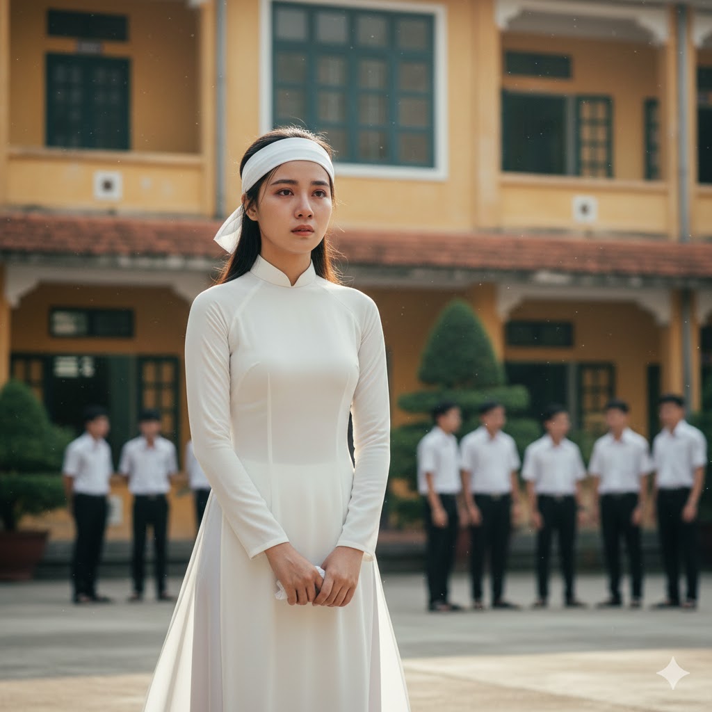 Sáng hôm đó, cả sân trường THPT Ngô Gia Tự như ngưng lại trong vài giây khi Ngọc Mai bước qua cổng. Cái khăn tang trắng buộc vội trên đầu như một lá cờ báo hiệu cho nỗi mất mát vừa xảy ra. Mùa hè oi ả khiến không khí thêm nặng nề, nhưng chẳng ai dám lên tiếng cười hay bàn tán. Tất cả đều nhìn cô gái nhỏ bé, học sinh lớp 12A3, với ánh mắt vừa tò mò vừa e dè.