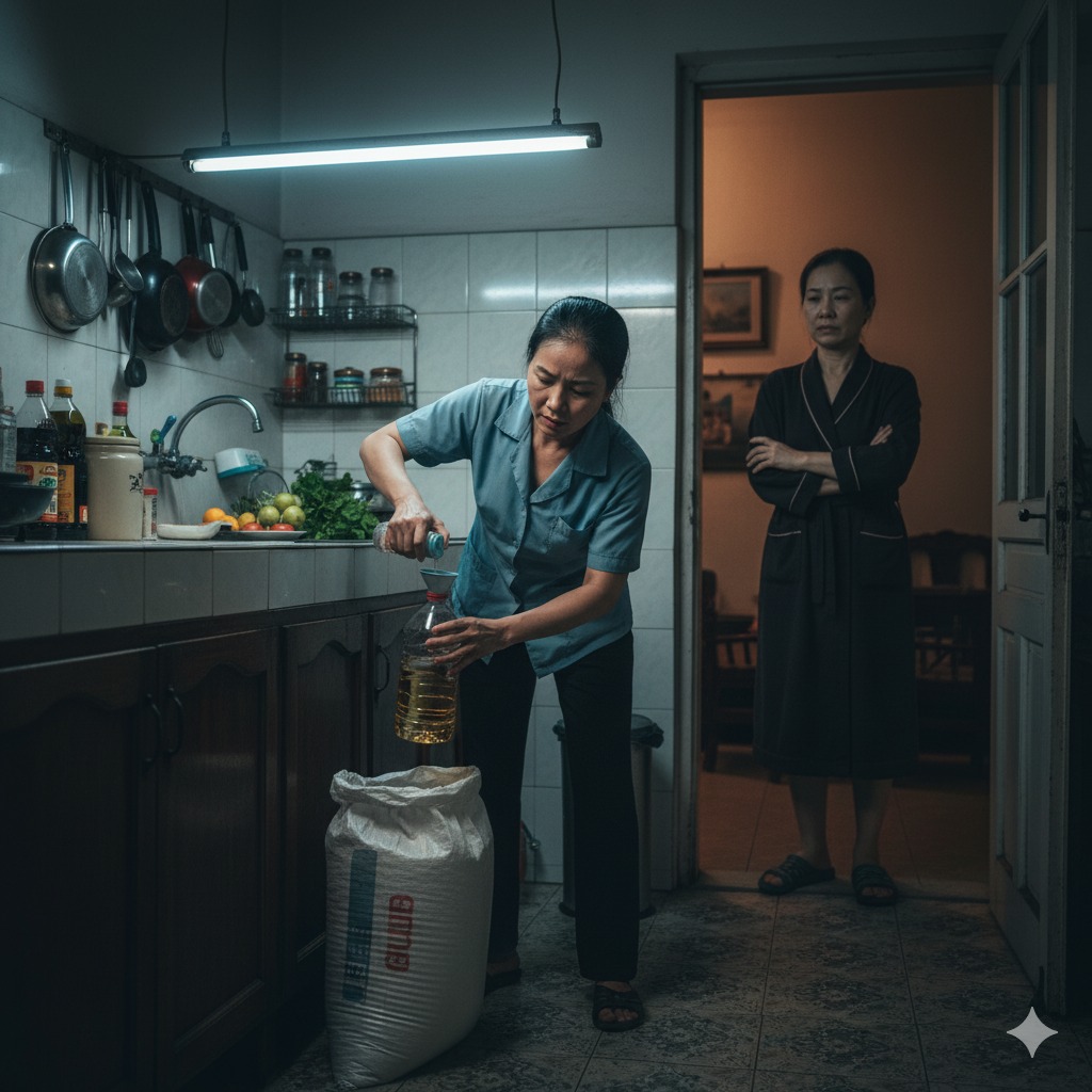 Từ ngày chị đến, nhà cửa gọn gàng, cơm nước tươm tất. Chị ít nói, làm việc cần mẫn, hầu như chẳng bao giờ kêu ca. Nhưng có một điều khiến tôi luôn băn khoăn: đêm nào tôi cũng thấy chị lén xuống bếp, mở lọ dầu ăn, chai mắm, hũ gạo… rồi múc đi một ít.