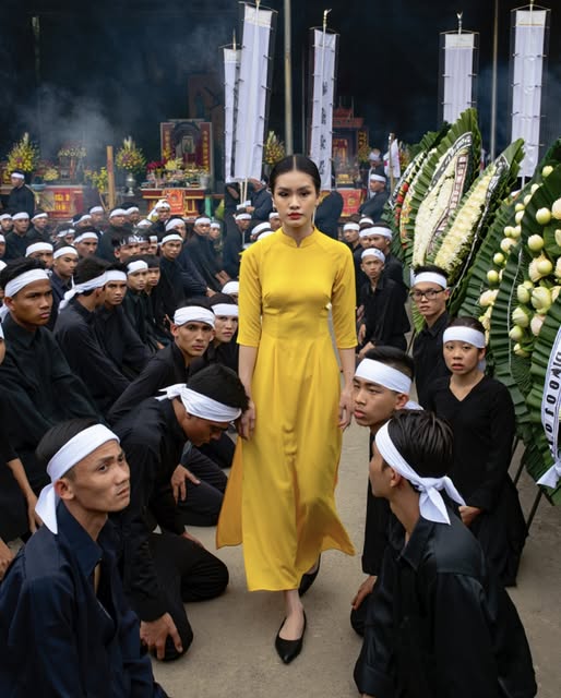 Hình ảnh Nhung mặc váy vàng rực rỡ đi qua đi lại trong tang lễ khiến mọi người khó hiểu. Họ bảo Nhung thiếu tôn trọng người đã khuất, ngày buồn mà ăn mặc điệu đà như vậy thật khó coi.