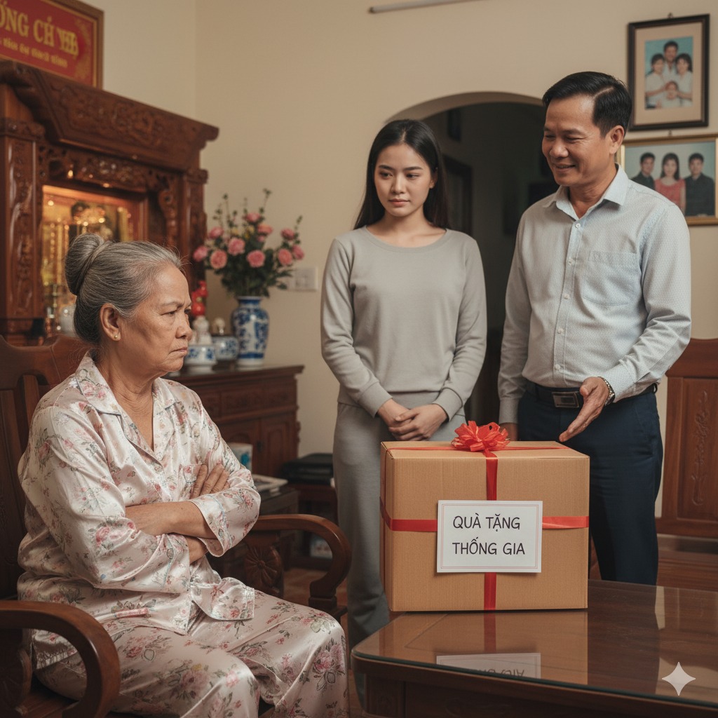 Tối hôm ấy, khi cả nhà tụ tập đông đủ, bà Tư mở quà. Chai dầu thơm khiến mọi người trầm trồ. Rồi bà cầm phong bì, nghĩ là tiền mừng. Nhưng khi xé ra, tất cả chết lặng: